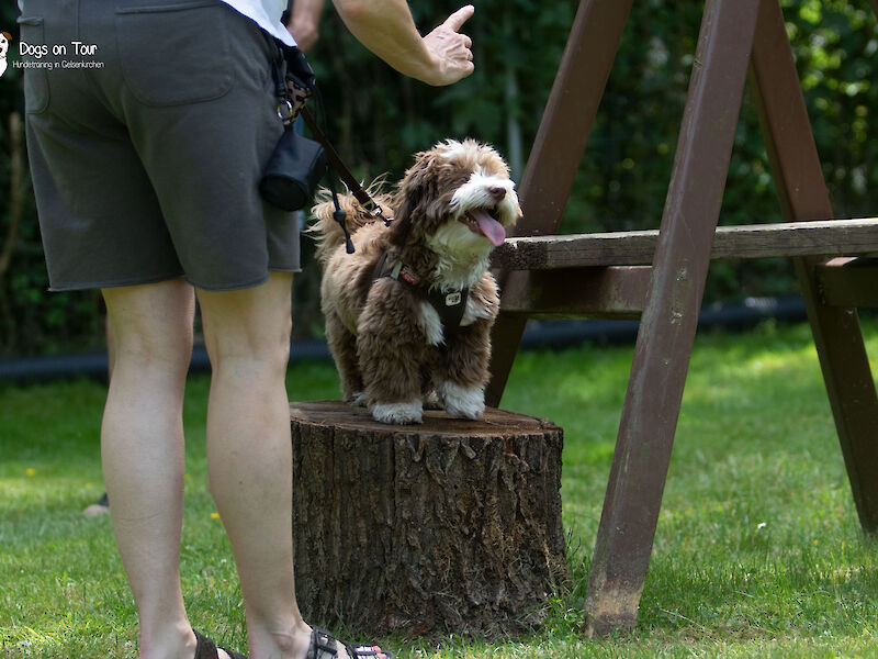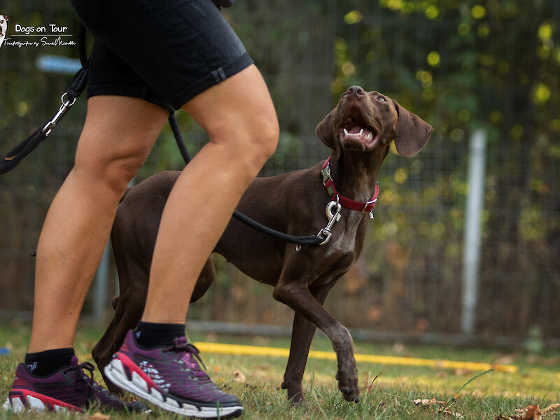 Jeder darf sein ganz persönliches Thema mitbringen. Möchte das eine Team vielleicht Hundebegegnungen üben, hat der andere Hund vielleicht Angst vor fremden Menschen und wieder ein Team möchte z.B. die Aufmerksamkeit steigern, oder bereitet sich grade auf einen Wesenstest vor.